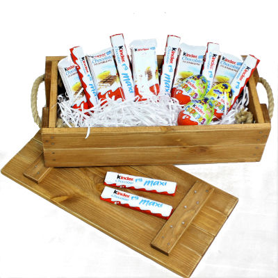 В составе деревянный ящик собственного производства, 3 Киндер-сюрприза, 6 Киндер макси, 5 Киндер шоколад со злаками