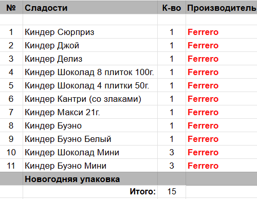 Киндер Сюрприз (1 шт), Киндер Джой (1 шт), Киндер Делис (1 шт), Киндер Шоколад 8 плиток 100г. (1 шт), Киндер Шоколад 4 плиток 50г. (1 шт), Киндер Кантри (со злаками) (1 шт), Киндер Макси 21 г. (2 шт), Киндер Буэно (1 шт), Киндер Бонс (1 шт)