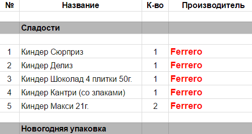 Киндер Сюрприз (1 шт), Киндер Делис (1 шт), Киндер Шоколад 4 плиток 50г. (1 шт), Киндер Кантри (со злаками) (1 шт), Киндер Макси 21 г. (2 шт)