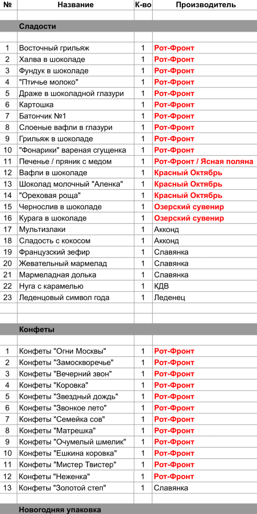 Восточный грильяж (1 шт), Халва в шоколаде (1 шт), Фундук в шоколаде (1 шт), "Птичье молоко" (1 шт), Драже в шоколадной глазури (1 шт), Картошка (1 шт), Батончик №1 (1 шт), Слоеные вафли в глазури (1 шт), Грильяж в шоколаде (1 шт), "Фонарики" вареная сгущенка (1 шт), Печенье / пряник с медом (1 шт), Конфеты "Огни Москвы" ,Конфеты "Замоскворечье" (1 шт), Конфеты "Вечерний звон" (1 шт), Конфеты "Коровка" (1 шт), Конфеты "Звездный дождь" (1 шт), Конфеты "Звонкое лето" (1 шт), Конфеты "Семейка сов" (1 шт), Конфеты  "Матрешка" (1 шт), Конфеты "Очумелый шмелик" (1 шт), Конфеты "Ешкина коровка" (1 шт), Конфеты "Мистер Твистер" (1 шт), Конфеты "Неженка" (1 шт)