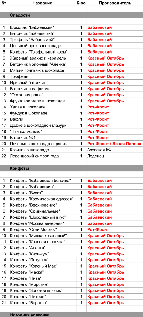 Шоколад "Бабаевский" (1 шт), Батончик "Бабаевский" (1 шт), Трюфель "Бабаевский" (1 шт), Цельный орех в шоколаде (1 шт), Конфеты "Трюфельный крем" (1 шт), Конфеты "Бабаевская белочка" (1 шт), Конфеты "Бабаевские" (1 шт), Конфеты "Визит" (1 шт), Конфеты "Космическая одиссея" (1 шт), Конфеты "Вдохновение" (1 шт), Конфеты "Оригинальные" (1 шт), Конфеты "Шоколадный вкус" (1 шт), Конфета "Москва вечерняя" (1 шт)